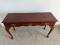 Beautiful dark wood console table. Has a single center drawer with pretty brass hardware. Cabriole legs and a scalloped front apron. Great for an entryway or as a small desk. No scratch. It’s like very new item.