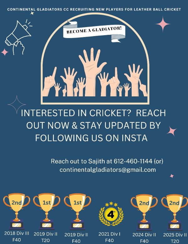 Hi All - We are looking for new players for our leather ball cricket team. Please reach out if you're interested!