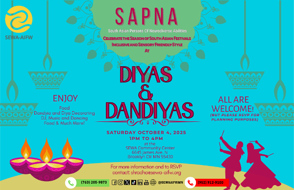 We are excited to announce that we will be hosting our next SAPNA (South Asian Persons Of Neurodiverse Abilities) meet-up this Saturday, October 4th from 1PM to 4PM at the SEWA Community Center! Make sure to put on some comfy clothes and join us for Diyas & Dandiyas where we will enjoy food and dancing together, along with a creative session of Dandiya and Diya decorating as we kick off our festival season. Please RSVP to this event by emailing shradha@sewa-aifw.org.